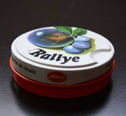 Descripción: Caja de lata de Caramelos Macizos Rallye marca Mauri. Sabor ciruela.