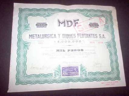Descripción: TITULO POR 10 ACCIONES POR VALOR DE 1000 PESOS DE METALURGICA Y DIQUES FLOTANTES S.A. DEL AÑO 1945