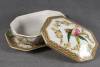 Descripción: Bella salsera con plato y tapa ricamente decorados con motivos florales y frutales de la casa "Q&Q". Marca en base. 20x14x11cm ( Valor = 1200 Euros ) Bella figura realizada en porcelana policromada en la que vemos la representación de dos pequeños niños desnudos, jugando al balancín sobre un tronco de madera. Marcas en la base. 17x18x9cm. ( Valor = 650 euros) |