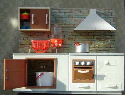 Descripción: Cocina de hojalata marca Punch con utensilios. Años 60. Con frigorífico hojalata.