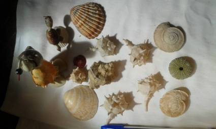 Descripción: Coleccion de conchas, que incluye dos figuras decorativos hechos con conchas. |