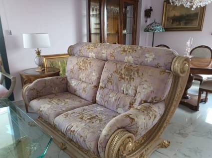 Descripción: Sofá de dos plazas de la firma reconocida internacionalmente Vidal Grau, la cual ya no se encuentra activa. La calidad y el trabajo realizado para conseguir los acabados de este sofá lo convierten en una pieza de coleccionista exclusiva. La tela se encuentra intacta y la ornamenta y pintura dorada en un estado impoluto.
