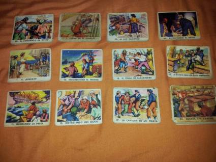 Descripción: Vendo 65 cromos de la Serie Piratas, creo que eran de los años 40, del Fabricante Teodoro Muller, con anuncio detras de la goma para mascar Boblero. La colección completa eran 72 cromos, en ésta faltan los números: 26,27,32,51,58,61 y 62.