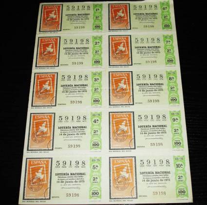 Descripción: año 1975 -dia mundial del sello 1975 100 ptas 23/75 bloque de 10 decimos precio el bloque GASTOS ENVIO INCLUIDOS nacional |