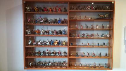 Descripción: Vendo un conjunto entero y no por separado de dos colecciones completas de figuras de plomo pintadas a escala 1/32 y una vitrina chapada de cerezo con 2 puertas de cristal, estanterías movibles, fondo blanco y con medidas 130cmx100cmx13,5cm: La colección "CABALLEROS DE LA EDAD MEDIA" Ed. Altaya del año 2002 consta de 52 caballeros de diferentes épocas de la Edad Media creación de la firma "Frontline Figures".Todas están sujetas a unas bonitas peanas de madera natural para su mejor estabilidad (complemento de mi invención), y cuenta con todos los fascículos encuadernados en 3 tomos. La colección "SOLDADOS DE PLOMO DE LA ANTIGUA ROMA" Ed. Planeta Agostini creada por "Figuras Andrea" del año 2003 consta de 51 figuras a pie y a caballo de diversas épocas del Imperio Romano. También cuenta con todos los fascículos encuadernados en 2 tomos. Entrego como regalo un carruaje de guerra romano tirado por dos caballos (biga romana) con 2 legionarios. Todo el material está nuevo y sin desperfectos. No dispongo de los embalajes originales. Gastos de envío a parte. Forma de pago transferencia bancaria.