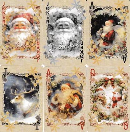 Descripción: Baraja de poker Merry Christmas. Las figuras y Jokers contienen motivos relacionados con la Navidad. Fabricada el año 2025. 52 Cartas + 2 Jokers + 1 carta presentación. Nueva. Sin usar. En su estuche de cartón original.