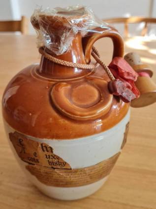 Descripción: Ye Whisky of Ye Monks de Luxe Scots Whisky Donald Fisher ltd. Edimburg Scotland. 12 Year Old Blended Scotch Whisky Botella de cerámica. Un pequeño golpe de traslado rompió la mitad del sello exterior y quito gran parte de la etiqueta. Salvo por este detalle, esta en perfectas condiciones.