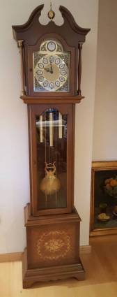 Detalles: Marca: Junghans, sinónimo de calidad alemana. Tipo: Reloj de pie con mecanismo de cuerda, pesas y péndulo. Material: Cuerpo de madera de nogal con acabados pulidos. Estado: Impecable. Dimensiones: Aproximadamente 190 cm alto x 45 cm ancho x 30 cm profundidad. Condición: Piezas originales y en buen estado.