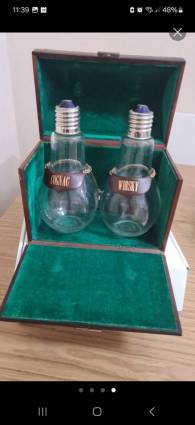 Descripción: COFRE ANTIGUO PIEL, CON BOTELLAS EN FORMA DE BOMBILLA DE CRISTAL ,DE WISKY Y COGNAC. |