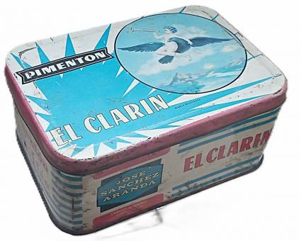 Descripción: Lata de pimentón de la marca "El Clarín":años 50 La lata es rectangular, de hojalata, con bordes redondeados y una tapa que se ajusta a presión. Predominando los colores blanco, azul claro y rosa. Presenta el nombre del fabricante "José Sánchez Aranda" en un recuadro en el lateral. Este tipo de envase era común para la venta de pimentón. |