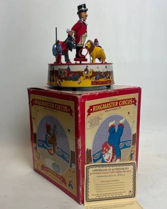 Descripción: Schylling Novelty Ringmaster Circus Windup es un juguete musical de hojalata coleccionable de estilo vintage. El juguete musical de cuerda Schylling Ringmaster Circus es una pieza coleccionable antigua que presenta un diseñode un maestro de ceremonias de circo junto con un payaso, un mono, un león y un elefante. Fabricado en hojalata litografiada, lo que le confiere un aspecto clásico y nostálgico. Características: Es un juguete de cuerda (wind-up) que, además de moverse, también es musical. Se vende con su caja original y un Certificado de Autenticidad. |