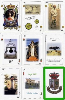 Descripción: Baraja española de Acehuche, Cáceres. Cada carta contiene monumentos o paisajes o personajes del pueblo de Acehuche. 40 Cartas + folleto explicativo. Edición limitada y numerada de 500 barajas. Fabricada en España por Naipes Comas el año 2001. Nueva. Sin usar. En su estuche de cartón original.