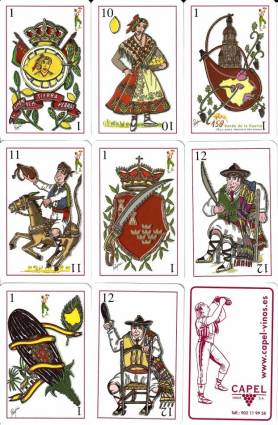 Descripción: Baraja española Bodegas Capel. El palo de oros son limones. Copas: botas; espadas: cuchillos huertanos; bastos: berenjenas. 40 Cartas. Fabricada en España por Naipes Comas el año 2001. Nueva. Sin usar. En su estuche de plástico transparente duro.