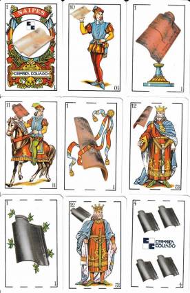 Descripción: Baraja española Cerámica Collado. Curiosa y original baraja dedicada a las tejas. Cada palo contiene una teja distinta de cerámica. 40 Cartas. Fabricada en España por Naipes Comas el año 2004. Nueva. Sin usar. En su estuche plástico transparente duro.