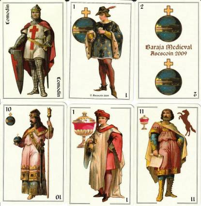 Descripción: Baraja española Medieval. Los ases, cuatros, figuras y el comodín muestran personajes de la nobleza europea de la Alta y Baja Edad Media. Fabricada por Naipes Comas el año 2009. Editada por Asescoin. 48 Cartas + 1 Comodín + 1 carta de presentación numerada. Edición limitada y numerada de 500 ejemplares. Nueva. Sin usar. Con su precinto de plástico transparente. En su estuche de cartón/plástico tipo corredera.