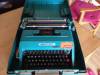 máquina de escribir electrónica con funda de protección y asa para transporte.
