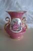 Jarrón de procedencia inglesa en color rosa y dorado. En el centro una imagen de una pintura de Fragonard....